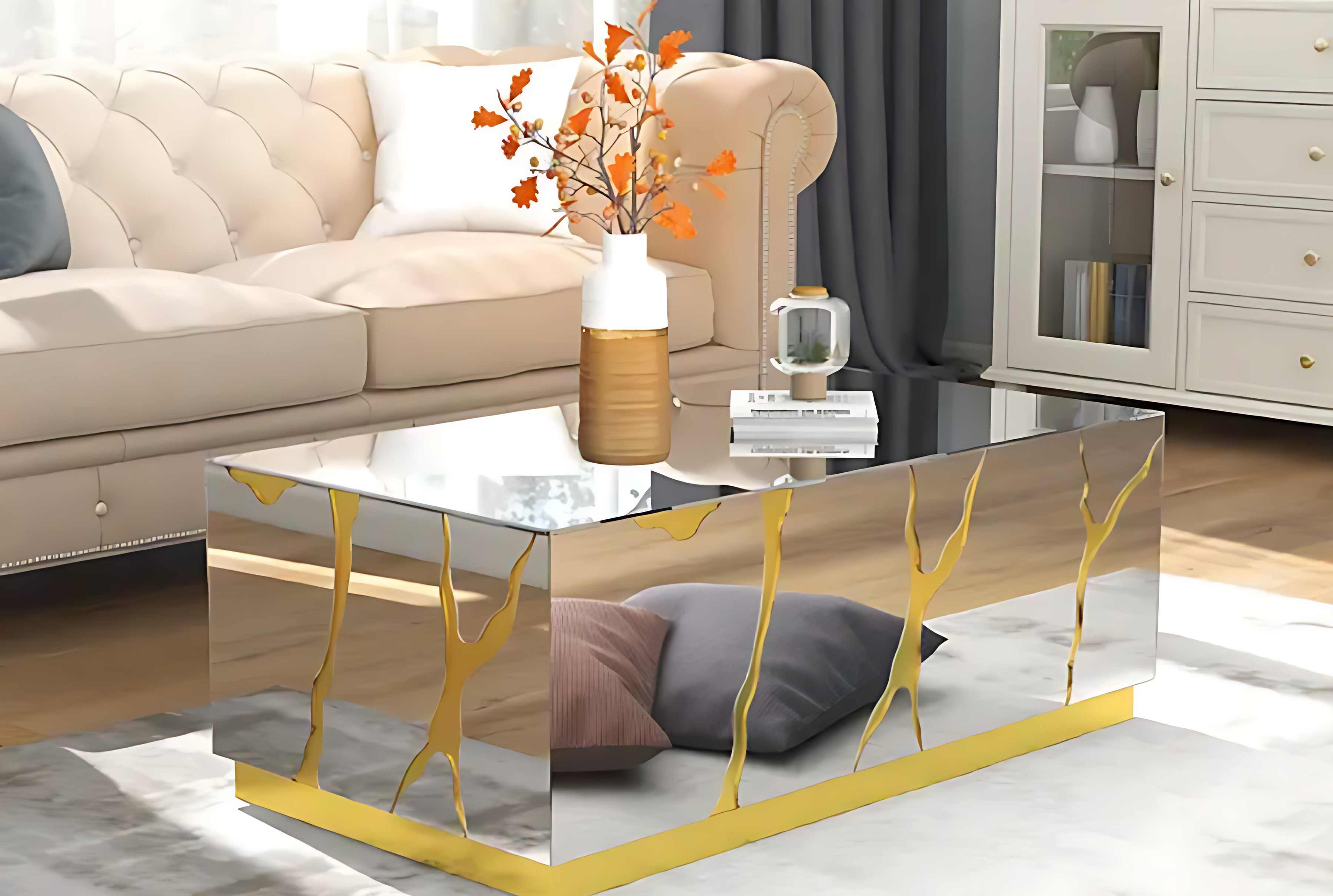 This boldly designed, uniquely styled rectangular coffee table, with its striking cracked design and mirrored tabletop, adds a touch of brilliance to your room and highlights its distinctive central feature.