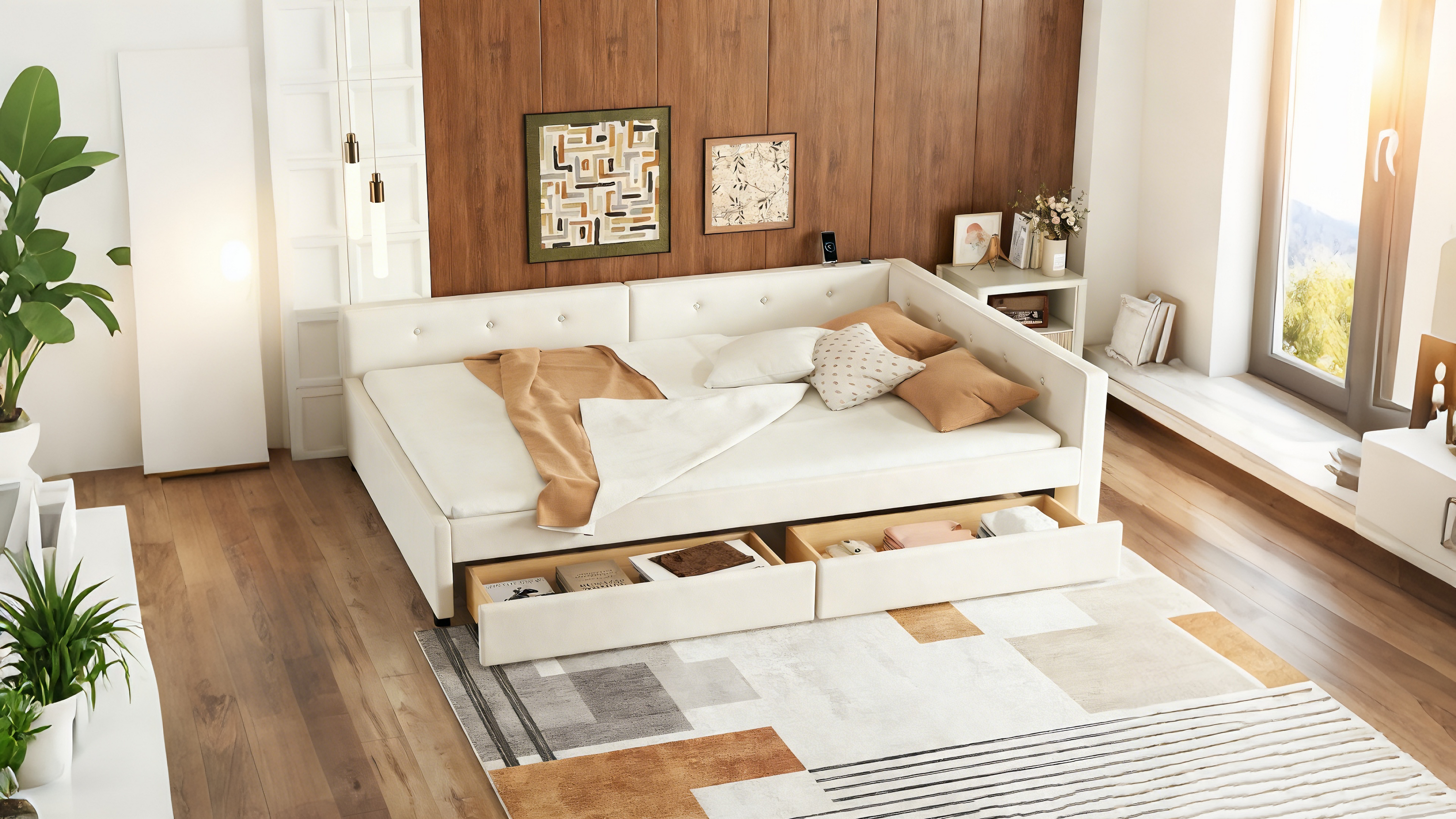 This solid pine full-size loft bed features a desk and drawers, boasting a simple yet elegant design.