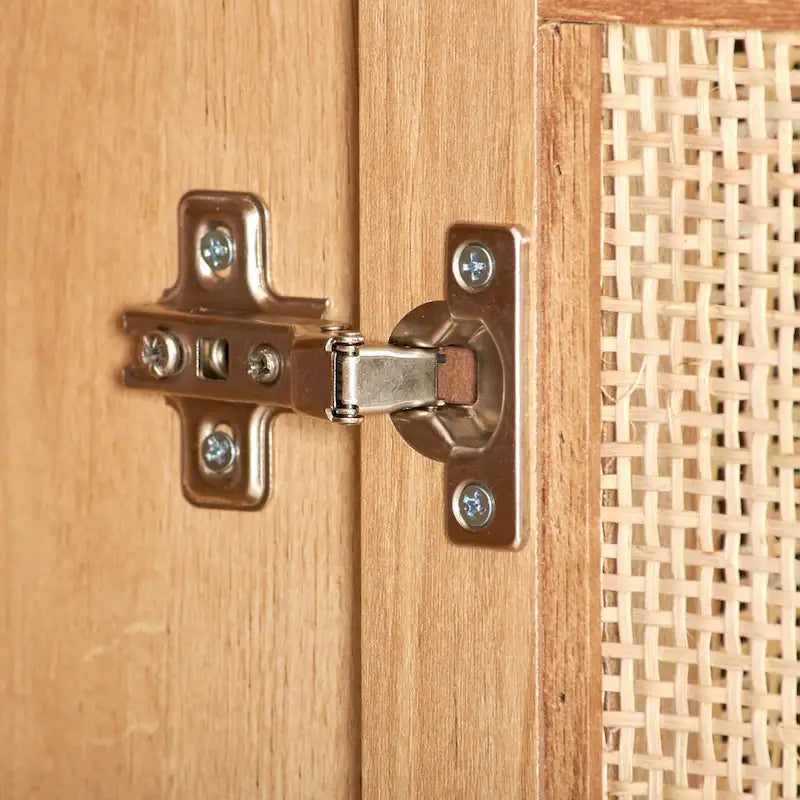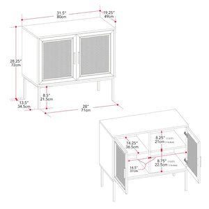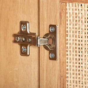 - Material: Wood with natural rattan doors, metal legs