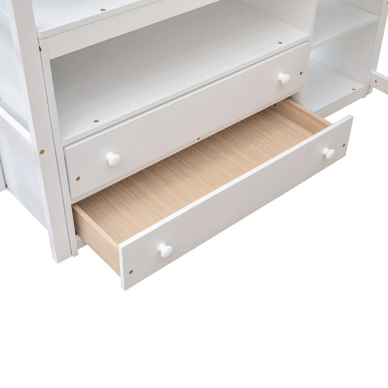 A full size loft bed with integrated desk, shelves, and two storage drawers. Crafted from solid pine wood and MDF with a slanted ladder and safety guardrails.