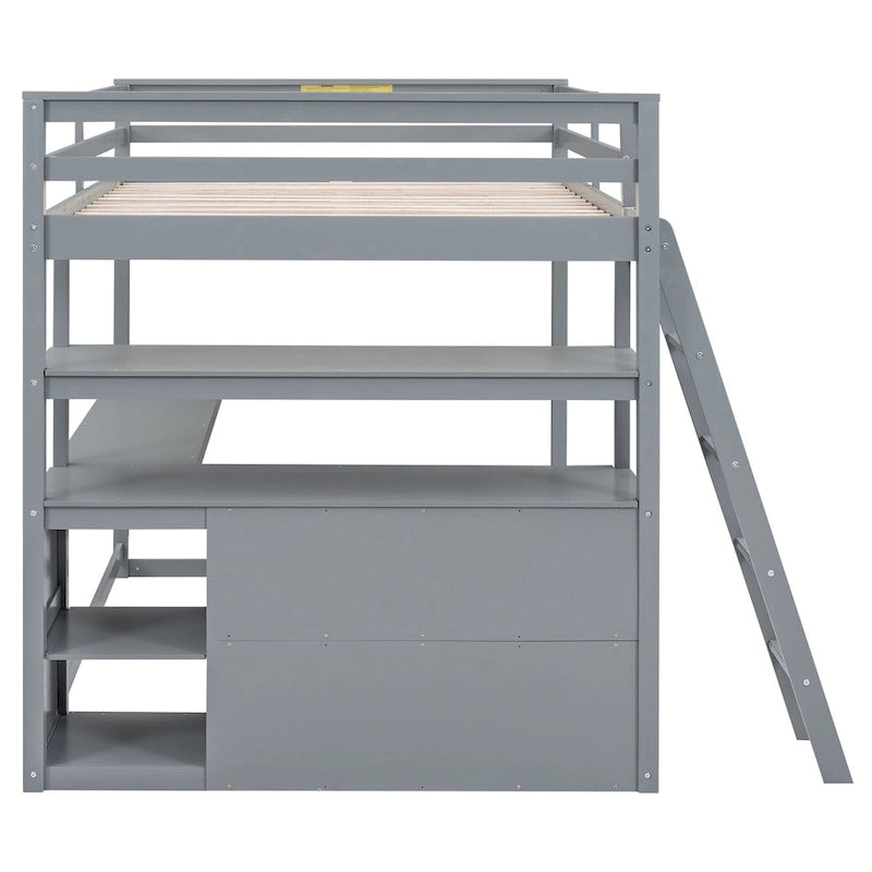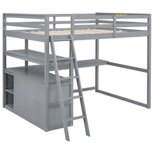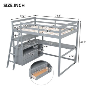 Full Size Loft Bed with Desk and Shelves,Two Built-in Drawers,Gray