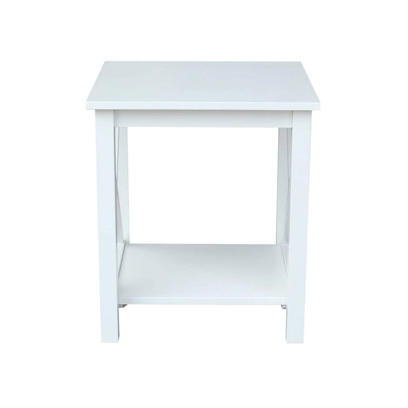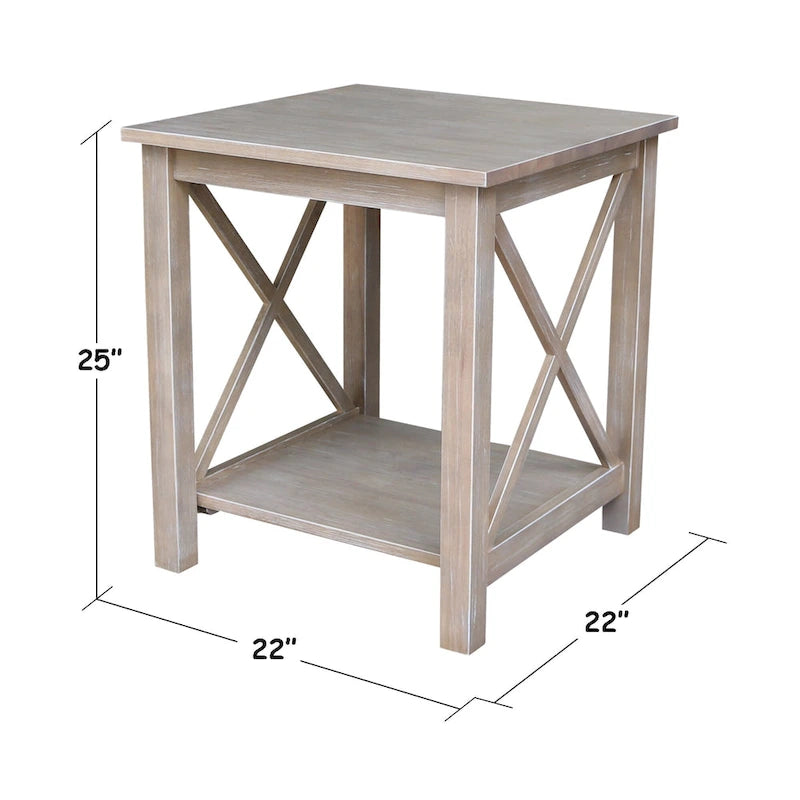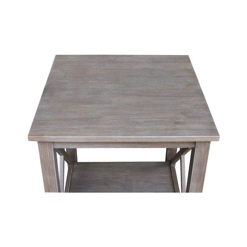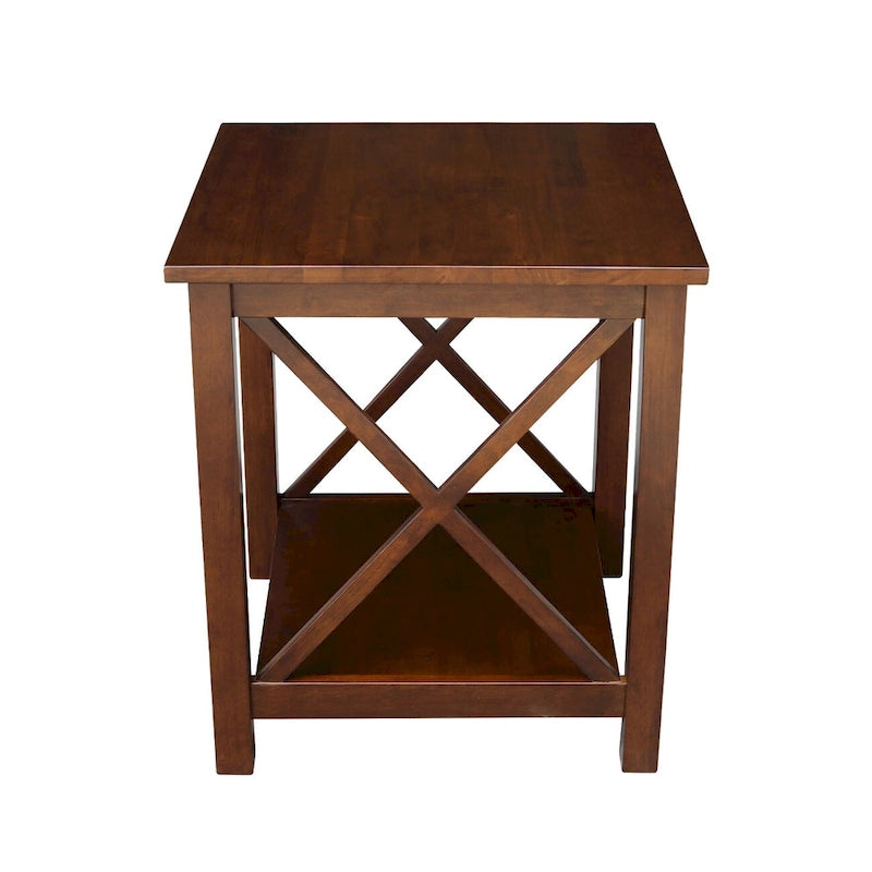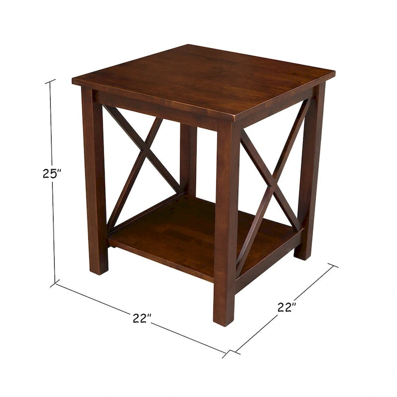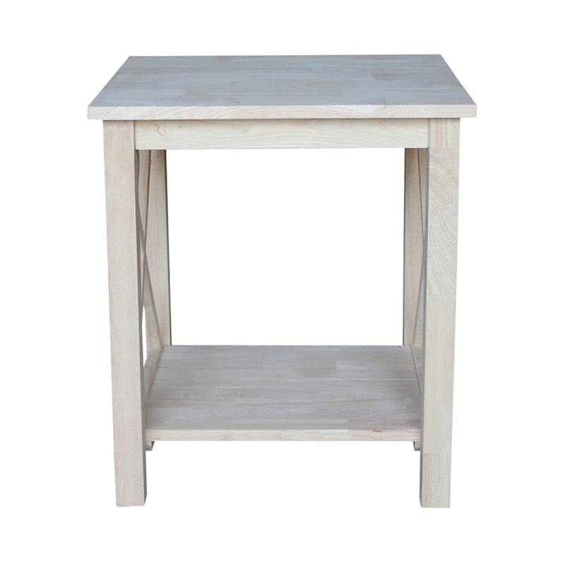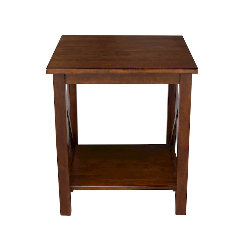 A solid hardwood end table with butcher block surface design and lower storage shelf. Made from parawood.