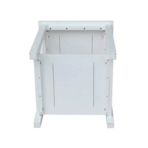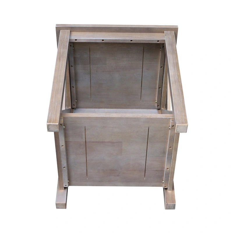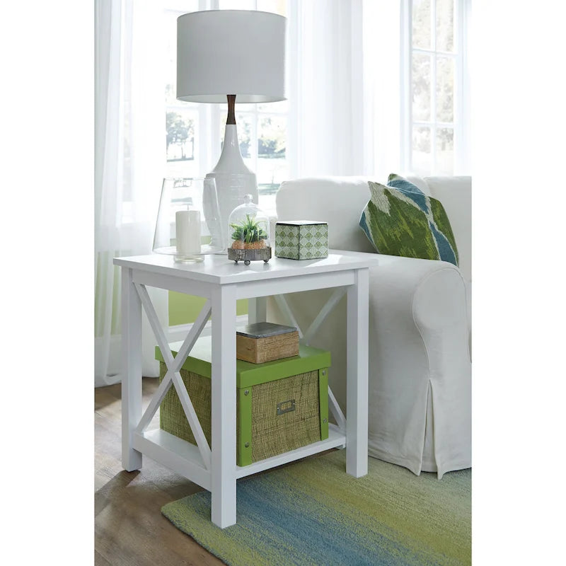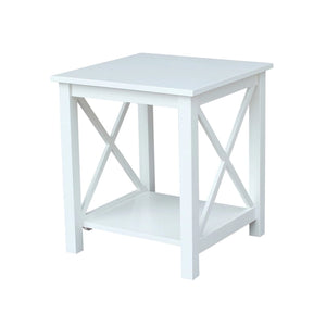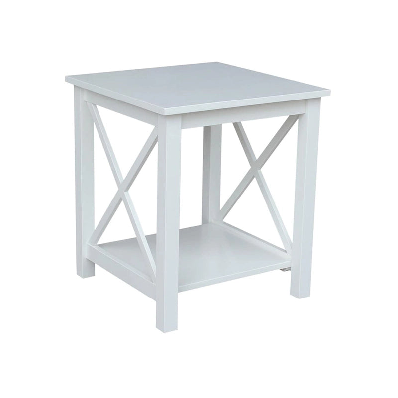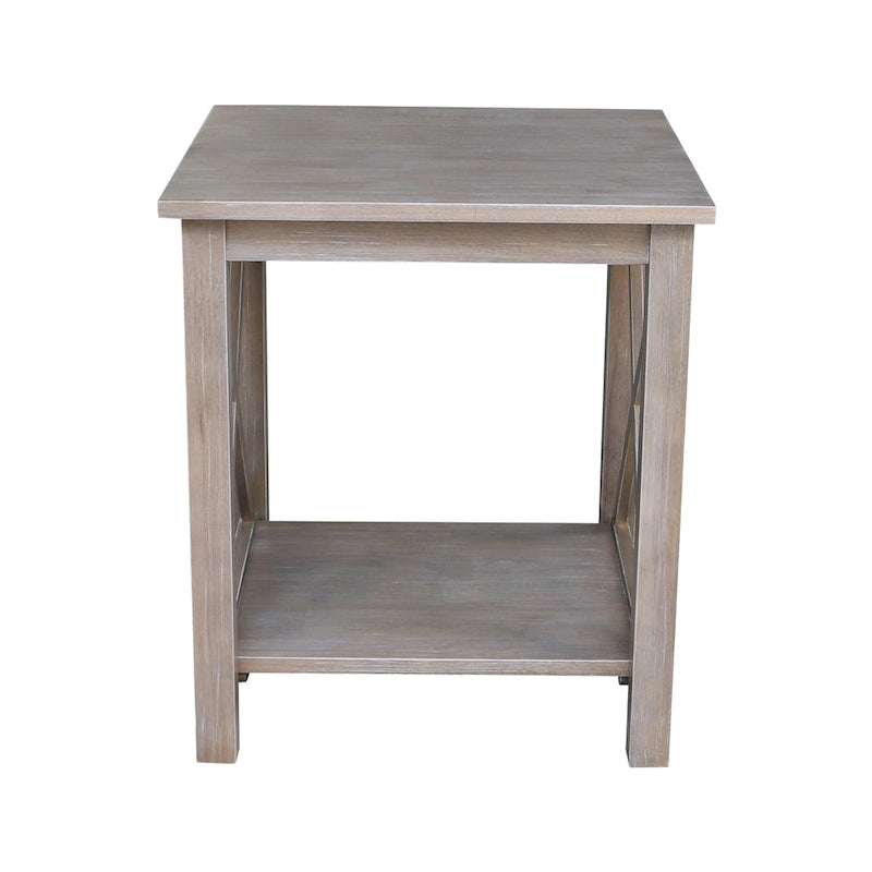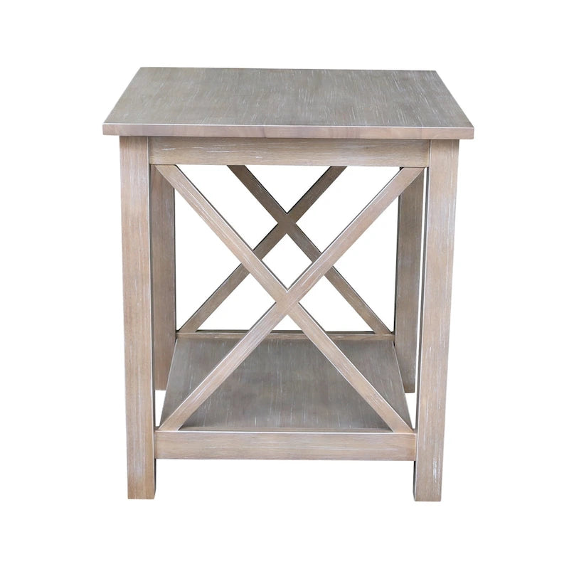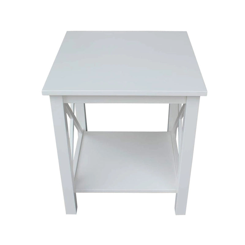 A solid hardwood end table with butcher block surface design and lower storage shelf. Made from parawood.