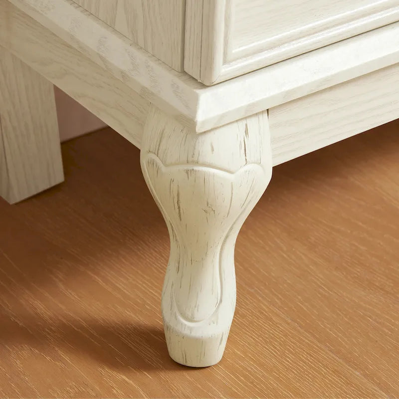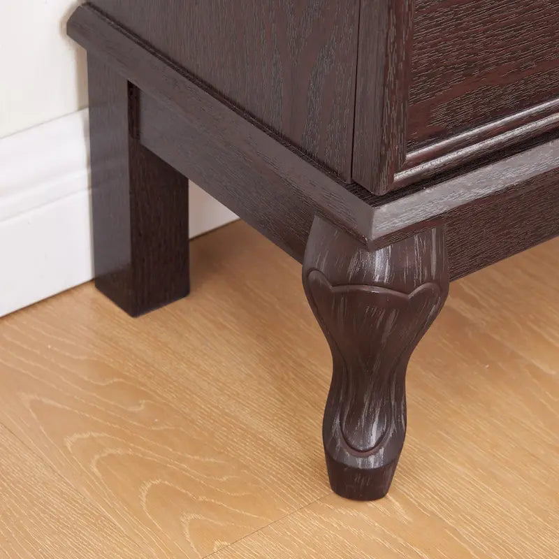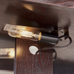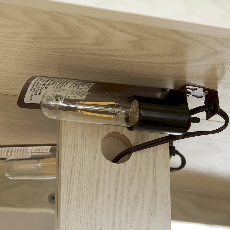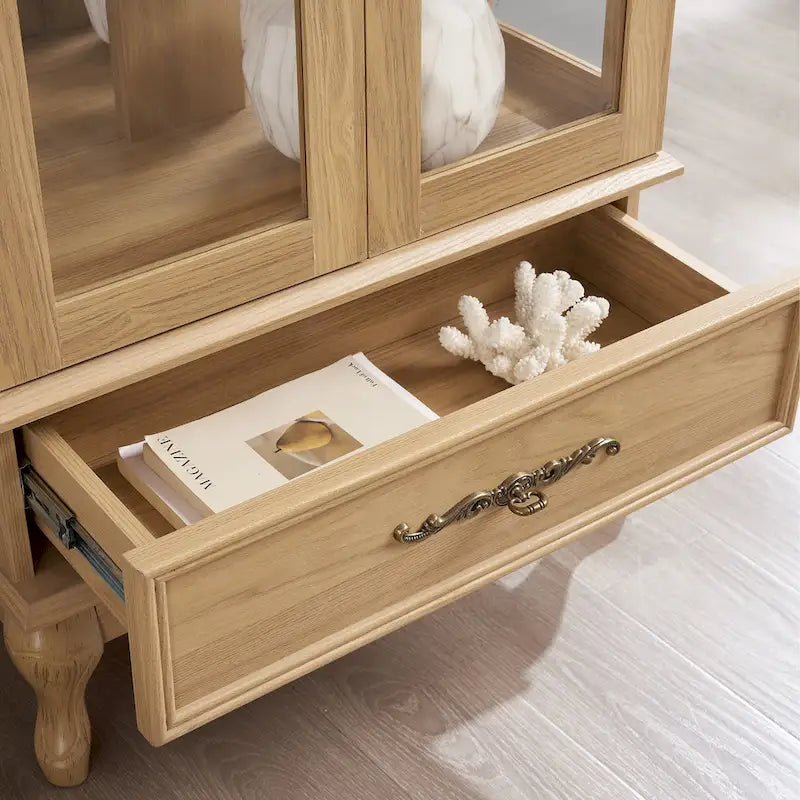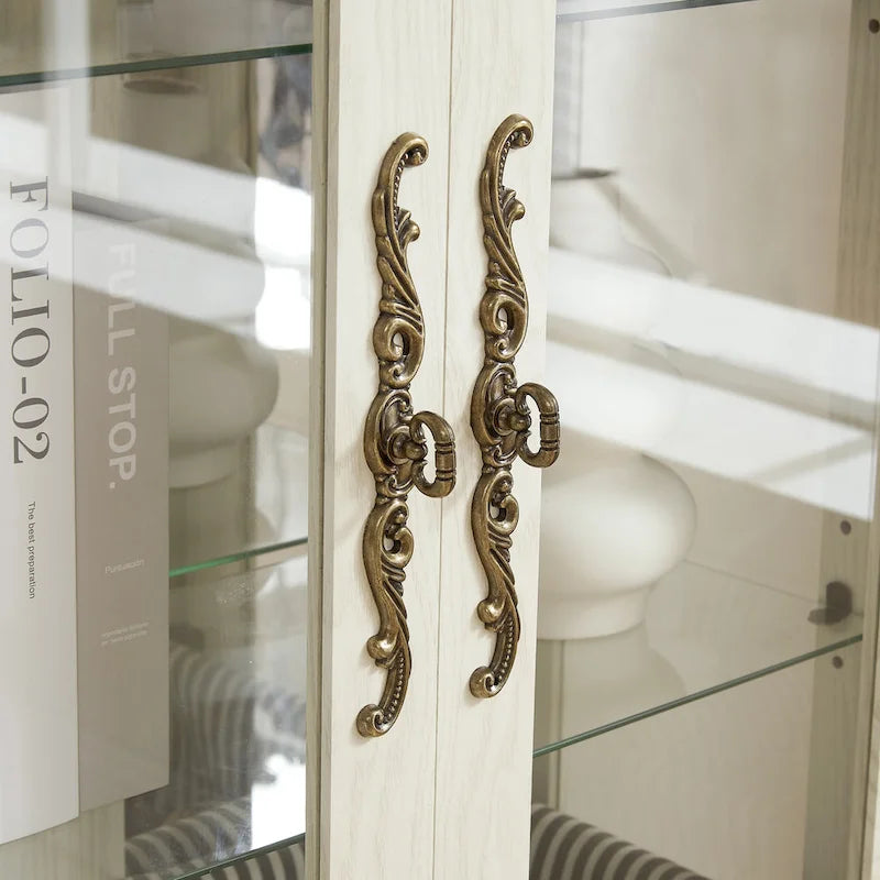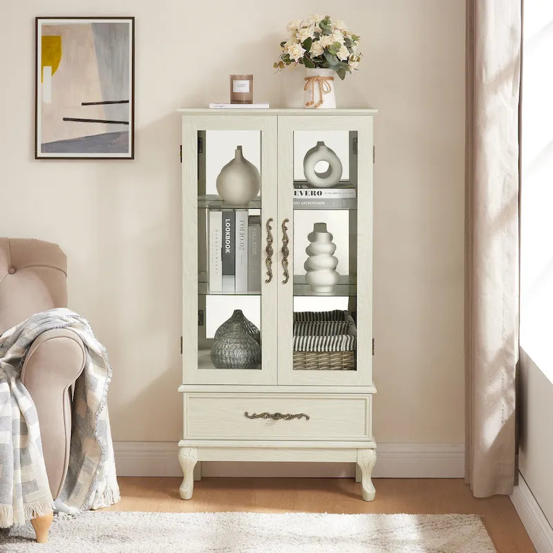 A glass display cabinet with internal lighting system, adjustable shelves, and vintage metal handles. Features 2 glass doors and 1 storage drawer.