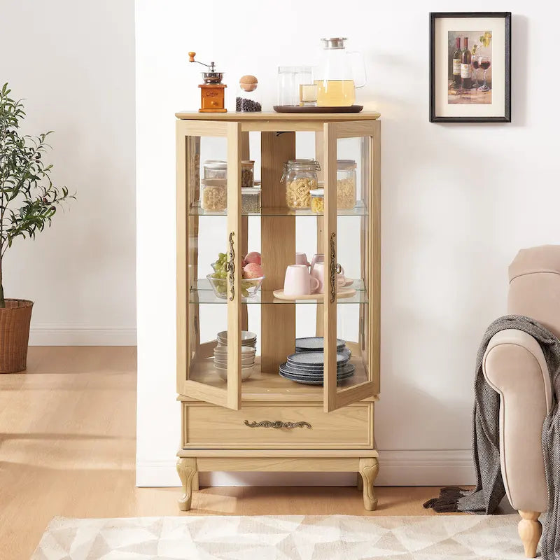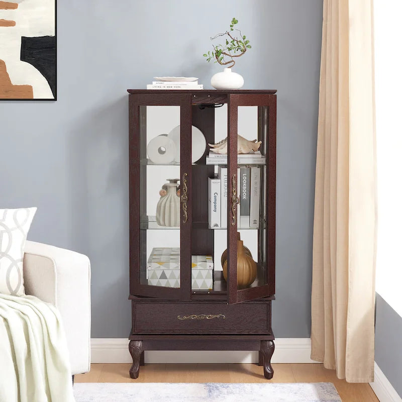 Lighted Glass Display Cabinet with 2 Doors and 1 Drawer