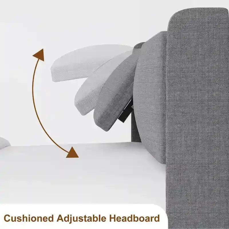 Platform bed with padded headboard featuring 4-level adjustable backrest and built-in USB charging ports.