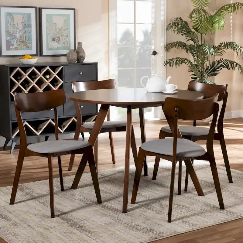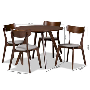 A 5-piece dining set with round table and 4 upholstered chairs. Constructed from rubberwood with walnut brown finish and light beige fabric seats.