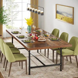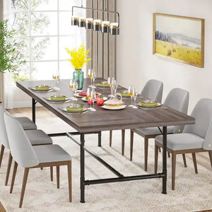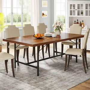 A rectangular dining table with MDF board top and black metal tube frame. Features industrial style design with rustic brown finish.